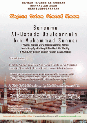 * Tempat: Masjid ‘Utsman bin ‘Affan Kompleks Ma’had Ta’zhim As-Sunnah, Jalan Raya Pekanbaru-Bangkinang KM.19,8 Rimbo Panjang, Kampar.